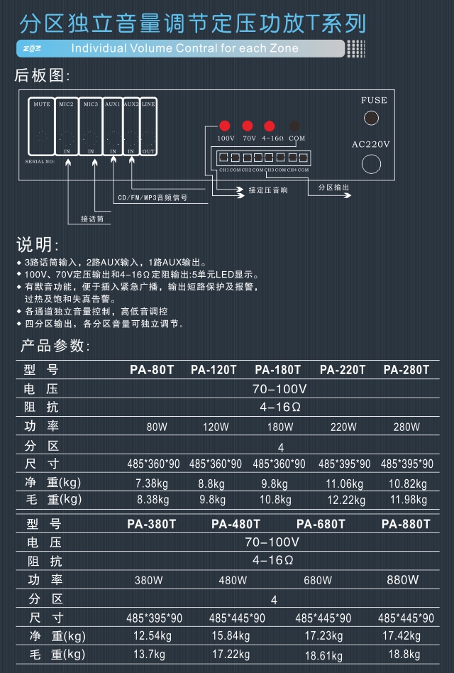 Product Name: The Zoning independent adjust the volume of the pressure amplifier T Series